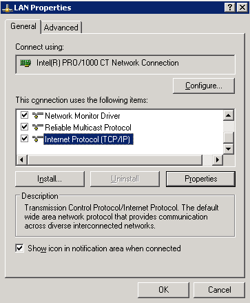 1. Click Start, Settings, Control Panel, Network Connections, LAN and Properties